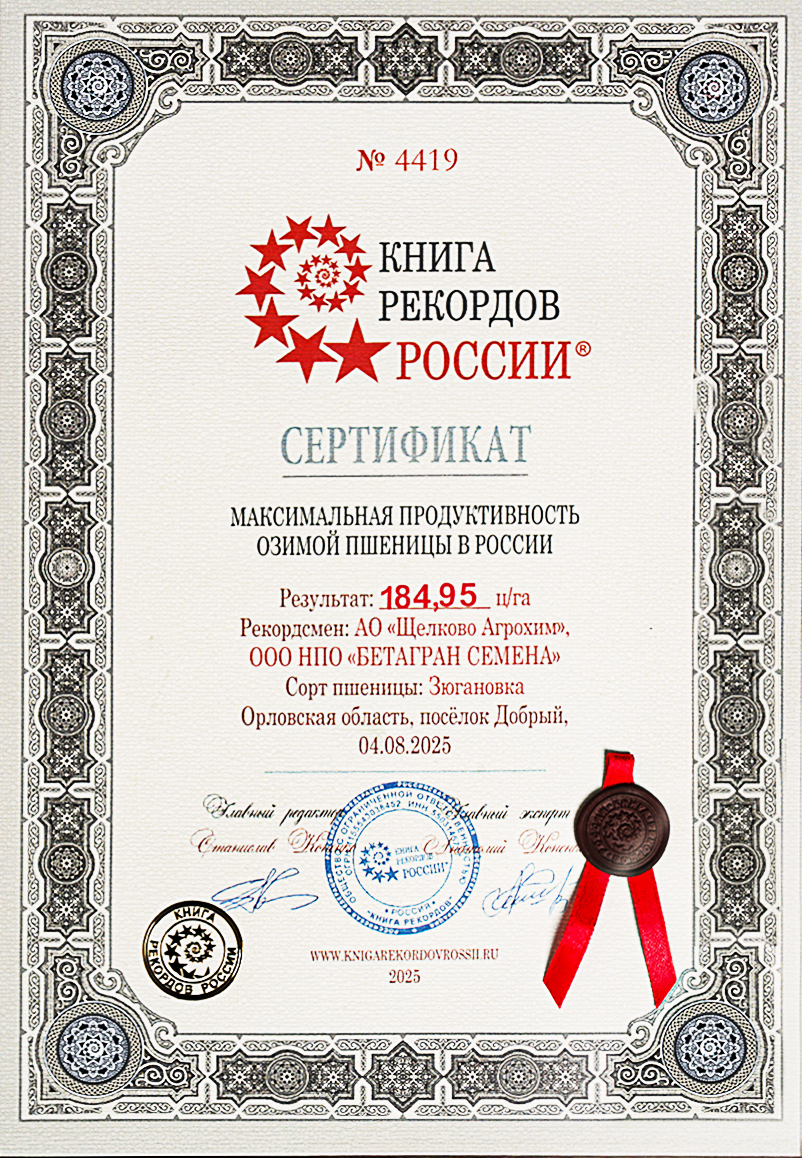 04.08.2025 г. поставлен новый рекорд по максимальной продуктивности растений озимой пшеницы в России. Новый сорт озимой пшеницы Зюгановка селекции «Щелково Агрохим», выращенный по технологиям компании в ООО НПО «Бетагран Семена» Орловской области на селекционных делянках, дал урожайность 184,95 ц/га и занесен в Книгу рекордов России.Регион допуска | На испытании |