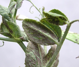 Основные симптомы - на верхней стороне листьев, прилистниках и черешках появляются желтоватые с черными границами пятна. Споры гриба сосредоточены с нижней стороны этих пятен в виде пушистого налета серовато-фиолетового цвета. Пораженные растения замедляются в росте, засыхают, семена становятся мелкими и щуплыми.