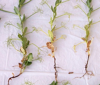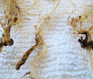 Семена могут загнивать в почве, что приводит к изреженности всходов. Всходы имеют красновато-коричневые, вдавленные поражения на корнях и основании стебля.Довольно часто загнивает точка роста молодых корешков. Растения становятся низкорослыми и желтыми.