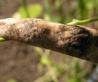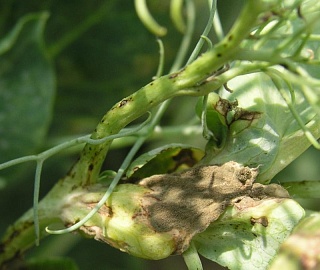 Развивается во второй половине вегетации растения. Проявляется изменением окраски пораженных органов, гнилями, некрозами, язвами и увяданием. Поражаются все надземные части растения. Больные цветки имеют бурую окраску, а на их лепестках формируется спороношение гриба. Такие цветки опадают, распространяя инфекцию на другие органы растения. На пораженных листьях сначала появляются грязно-зеленые водянистые пятна, со временем увеличивающиеся, затем загнивают, покрываются серым налетом и опадают. Пятна находятся на нижней стороне листа.Болезнь развивается в период налива и созревания бобов. При инфицировании бобов в начале их формирования, семена на них образуются, но при влажной погоде покрываются спороношением патогена, загнивают и опадают, а при отсутствии осадков становятся плоскими и долгое время остаются на растении. Поражение бобов в зеленой спелости приводит к инфицированию семян и потере ими посевных качеств. В фазе полной спелости семена поражаются только при затяжной дождливой погоде. Пораженные семена гороха теряют блеск, становятся трухлявыми, с бурыми расплывчатыми пятнами, в конце вегетации видны мелкие черные склероции разной формы.