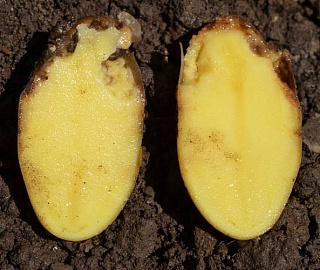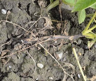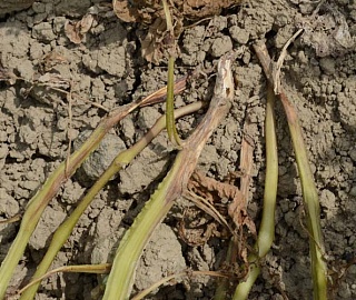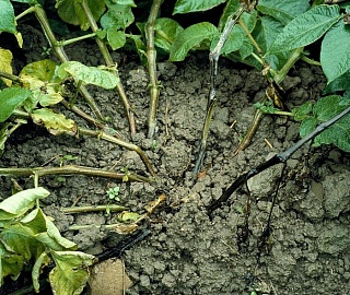 всходов. Листья желтеют, свертываются в трубочку и засыхают. Стебель также желтеет и увядает. При быстром развитии болезни (наблюдается в жаркую погоду при высокой влажности) уже через 4-6 дней после поражения почерневшая часть больного стебля размягчается, он надламывается, не выдерживая собственного веса. На поперечных срезах стеблей заметно побурение сосудистых пучков. При помещении конца стебля в воду заметно выделение слизи. Иногда у растений поражаются один или несколько стеблей.
