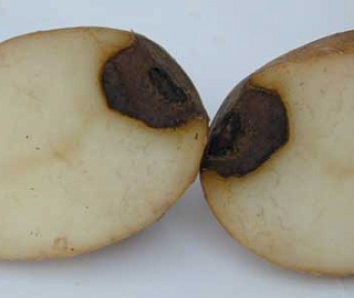 Клиновидные язвы всегда меньше или равны по размеру поверхностному пятну на перидерме. На разрезе клубня отмечены удлиненные конусовидные полости, распространяющиеся по мякоти вглубь. Часто на внутренней поверхности язв встречаются пикниды. По консистенции пораженная ткань варьирует от влажной до сухой.