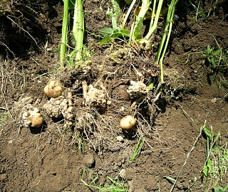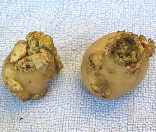 - При обнаружении зараженного растения необходимо собрать и уничтожить зараженные клубни, ботву, столоны с наростами. Ботву высушивают и сжигают. Клубни и столоны закапывают в яму на глубину не менее 1 м в глубину и обеззараживают 2,5%-ным раствором 60%-ного нитрафена.