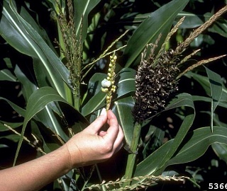 Поражаются только метелки и початки. Метелки превращаются в пылящую черную массу. Вместо початка образуется овально-конусовидный ком волокон и спор гриба. К моменту наступления молочной спелости обертки желвака высыхают и раскрываются. Споры распыляются медленно, они удерживаются остатками волокон початка вплоть до созревания кукурузы. Больные растения отстают в росте, при этом листья сильно разрастаются, наблюдается фасциация.Источник инфекции: телиоспоры гриба сохраняются долгое время в почве и на зерновках.