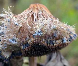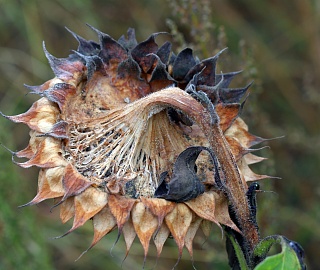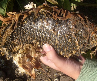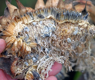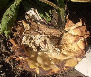 Заражение корзинок - наиболее вредоносная форма. Наблюдается с фазы цветения и продолжается вплоть до созревания подсолнечника. На тыльной стороне зараженных корзинок формируется мокрое, гниющее пятно бурого цвета, увеличивающееся в размерах и постепенно захватывающее большую часть корзинки и некоторую часть стебля. Грибной мицелий развивается в губчатой ткани и пронизывает семена. Корзинки сгнивают частично или полностью. Возбудитель проникает под семенную оболочку, при этом семена теряют свою хозяйственную ценность и служат источником инфекции.