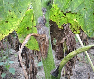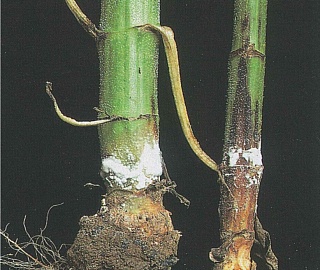 Гибель всходов может быть вызвана отмиранием подсемядольного колена при инфицировании растения в фазу прорастания и появления всходов. Корни растения разлагаются, а семядольные листья увядают. Заражение подсолнечника в фазу 3-5 настоящих листьев приводит к побурению основания стебля и размягчению тканей, с обнажением каркаса стебля и образованием на нем ярко выраженного белого налета. При этом на месте поражения стебель размягчается и легко отламывается.Стеблевая форма по симптоматике схожа с прикорневой, только пораженные участки располагаются на разной высоте. Стебель в этих местах приобретает светло-бурую окраску, размочаливается и загнивает. Пятно поражения быстро разрастается, охватывая весь стебель, который надламывается, и урожай теряется полностью. На месте поражения образуется белая грибница, в дальнейшем она превращается в черные склероции, которые можно увидеть на поверхности и внутри стеблей в большом количестве.