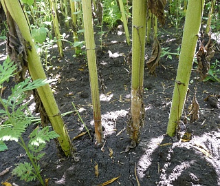 Гибель всходов может быть вызвана отмиранием подсемядольного колена при инфицировании растения в фазу прорастания и появления всходов. Корни растения разлагаются, а семядольные листья увядают. Заражение подсолнечника в фазу 3-5 настоящих листьев приводит к побурению основания стебля и размягчению тканей, с обнажением каркаса стебля и образованием на нем ярко выраженного белого налета. При этом на месте поражения стебель размягчается и легко отламывается.Стеблевая форма по симптоматике схожа с прикорневой, только пораженные участки располагаются на разной высоте. Стебель в этих местах приобретает светло-бурую окраску, размочаливается и загнивает. Пятно поражения быстро разрастается, охватывая весь стебель, который надламывается, и урожай теряется полностью. На месте поражения образуется белая грибница, в дальнейшем она превращается в черные склероции, которые можно увидеть на поверхности и внутри стеблей в большом количестве.