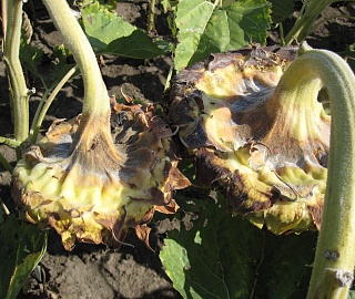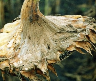 Поражает подсолнечник на протяжении всего периода вегетации. Поражаются всходы, стебли, корзинки и семена. Основной отличительный признак болезни - пепельно-серый налет, образованный мицелием и конидиальным спороношением гриба. Заражение проростков приводит к их гибели. На стебле болезнь проявляется побурением пораженного участка и разрушением тканей стебля в месте поражения. В тоже время часть стебля, расположенная выше, увядает и поникает. Наиболее вредоносно поражение корзинок подсолнечника. Особенно часто болезнь проявляется на обратной стороне корзинок в виде темно-коричневых некрозов, на поверхности которых формируется конидиальное спороношение концентрическими кругами серого цвета. В дальнейшем на них и других частях растений образуются мелкие, округлые или продолговатые черные склероции. Потери урожая могут достигать значительных размеров.