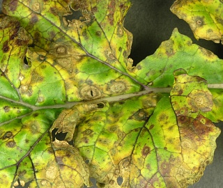 При высокой влажности воздуха на пораженных частях растения можно увидеть черноватый налет конидиального спороношения гриба.
