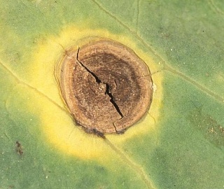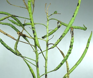 Грибы рода Alternaria (A.brassicae (А. brassicicola)) вызывают черную пятнистость рапса. Заболевание можно обнаружить во вторую половину вегетации при наступлении влажных погодных условий. Черная пятнистость развивается на всех надземных органах растения (листьях, стеблях и стручках). На листьях пятна сначала мелкие темные, затем разрастаются, становятся серо-коричневые с хорошо заметными концентрическими кольцами, что придает им вид мишени. Часто пятна окружены желтым кольцом (хлорозом). Центр их становится ломким, ткань разрывается. Пятна могут сливаться и покрывать весь лист. Обычно возбудитель заражает нижние более старые листья. На стеблях пятна удлиненные темно-коричневые до черного резко очерченные. На стручках пятна овальные или округлые концентрические, черные. При влажной погоде стручки преждевременно растрескиваются.