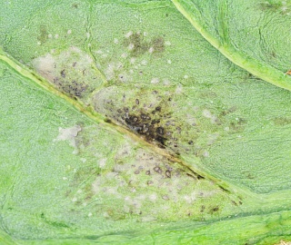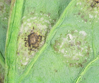 Патоген проявляется на всех надземных органах растений. На листьях появляются небольшие светло-зелёные пятна, которые потом увеличиваются, становятся буроватыми, вокруг них образуются многочисленные белые точки спороносцев гриба (хлопьевидный белый налет). Позже пятна растрескиваются, лист деформируется, преждевременно отмирает. На стебле продолговатые, светло-коричневые пятна, часто с заостренными концами, размером 1-15 см в длину, 0,5-2 см в ширину с темно-коричневой каймой. При сильном поражении прекращают рост и деформируются. Цветочные бутоны темнеют, не раскрываются, часто опадают. На стручках образуются бежевые пятна с тёмной каймой. Стручки скручиваются и преждевременно раскрываются. Поражённые черешки со струпьями и поперечными трещинами.