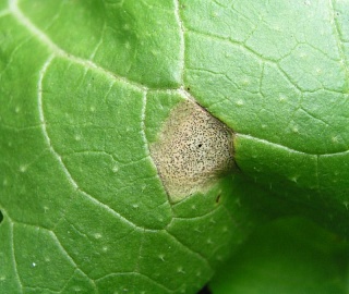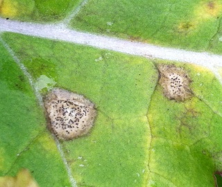 На листьях болезнь проявляется в виде серых пятен с темными пикнидами, позже высыхающих и растрескивающихся.