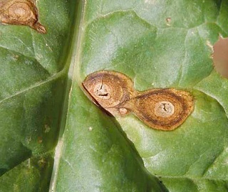 Заболевание второй половины вегетационного периода. Проявляется на нижних листьях в виде округлых крупных некротических пятен желтого и светло-бурого цвета с хорошо заметными концентрическими кругами. Пятна постепенно разрастаются, сливаясь, и на них позднее появляются мелкие черные точки - пикниды. Гриб также вызывает поражение всходов свеклы корнеедом, зональную сухую гниль корнеплода и кагатную гниль. На семенниках: на черешках листьев, стеблях, цветоносных побегах появляются некрозы в виде бурых продольных пятен, на которых также образуются пикниды. Гриб также поражает лепестки околоцветника и инфицирует клубочки семян.