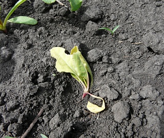 - Поражение свеклы в фазе всходов похоже на поражение Pythium (почерневшие корни и перетяжки) с последующей гибелью проростка.