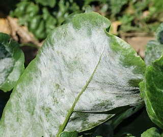 Поражаются растения первых двух лет. На листьях с верхней и нижней стороны появляются очаги белого налёта, которые быстро разрастаются и становятся более плотными, мучнистыми. Очаги могут располагаться на стеблях и клубочках свеклы. При встряхивании растений налёт пылит. Во второй половине лета на нём образуются сначала бурые, а позже чёрные точки - клейстотеции.Источник инфекции