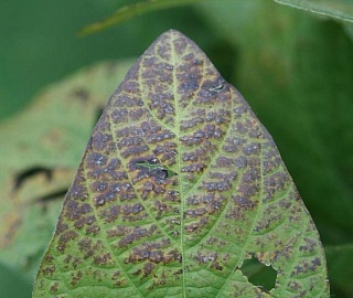 Поражает сою во все фазы и проявляется на листьях, стеблях, бобах и семенах. Инфекция распространяется только в семенной оболочке. При прорастании больных семян, которые отличаются окраской от слабо-розовой до пурпурно-черной, семядольные листочки становятся темно-пурпурными и опадают. На стебле появляются охватывающие темно-пурпурные некротические пятна. На листьях пятна красновато-коричневые от мелких до крупных (1 см в диаметре). На бобах пятна вдавленные, красно-пурпурные, овальные или угловатые, до 2 см. Больные растения часто погибают, иногда плодоносят, образуя больные семена. Гриб сохраняется в растительных остатках и семенах до двух лет и более.