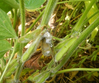 Повсеместно распространенное заболевание сои. Обнаруживается в конце цветения - начале бобообразования в виде светлых пятен, которые во влажную погоду превращаются в мокрую гниль, а в сухую - в трухлявую массу. Пятна становятся бурыми, покрываются белым плотным ватообразным налетом, на котором образуются черные крупные склероции разной формы и величины.