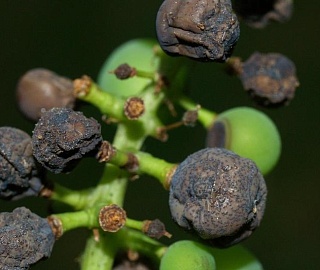 вокруг неё стремительно образуется светло-коричневое кольцо. За 10 дней вместо долгожданной ягоды образуется сухая, черная, твёрдая мумия, начинённая спорами гриба. Болезнь быстро передается в кисти от больных к здоровым ягодам.