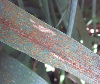 На верхней стороне листьев, реже на листовых влагалищах, охристо-коричневые (ржавые) скопления мелких порошащих подушечек-пустул с уредоспорами, беспорядочно разбросанных по всей поверхности листа. Позднее на нижней стороне стареющих листьев можно обнаружить пустулы-телии в виде черных блестящих подушечек под эпидермисом. В период вегетации развивается несколько поколений уредоспор, которые, разлетаясь, заражают все новые растения и способны вызвать массовое поражение посевов. При сильном поражении уредолустулами покрывается почти вся листовая пластинка, появляется ожог и листья скручиваются.