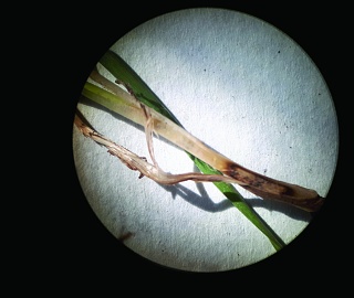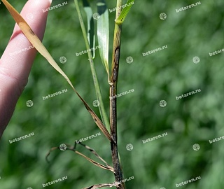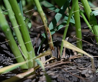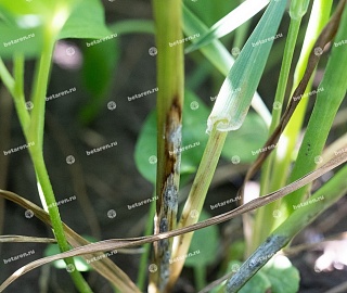 Первые симптомы появляются на колеоптиле, с которого гриб проникает внутрь, заражая ниже расположенные ткани зачаточных листьев, стебля и колоса, также при контакте с почвенной инфекцией возможно инфицирование эпикотиля.