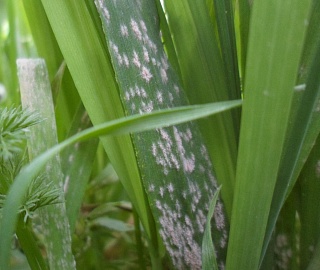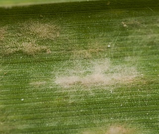 - Беловатый паутинистый налет, со временем приобретающий мучнистый вид и превращающийся в плотные, похожие на вату подушечки грязновато-серого оттенка. В них образуются небольшие плодовые тела, называемые клейстотециями, в виде черных точек.