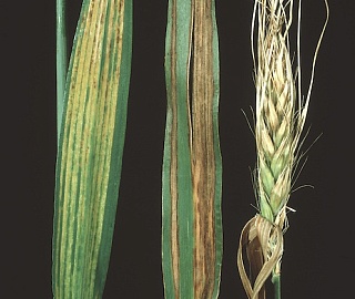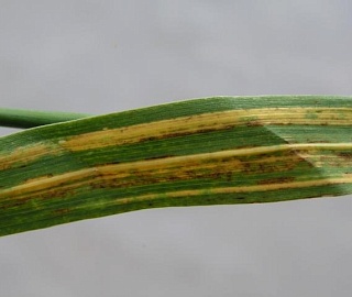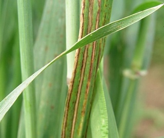 Первые признаки заболевания можно обнаружить в фазу кущения. На молодых листьях образуются желтые полосы, вытянутые вдоль пластинки листа. Пятна позже приобретают коричневый цвет, некротизируются, сливаются в широкие полосы, на них появляются продольные разрывы. Листья высыхают или отмирают. Растение отстает в росте. На пораженных растениях колос или не развивается или остается бесплодным.