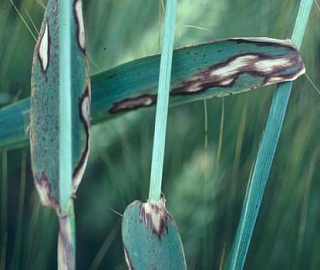 Болезнь поражает листья и листовые влагалища всех ярусов. На листьях и листовых влагалищах вначале образуются водянистые серо-голубые овальные светлые пятна, напоминающие фузариозный ожог, которые затем приобретают серо- или светло-коричневый цвет. У ячменя они имеют характерную темно-коричневую кайму до 2 мм шириной, окруженную хлорозом, на ржи и тритикале пятна длиннее и без каймы.