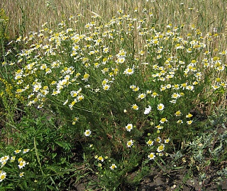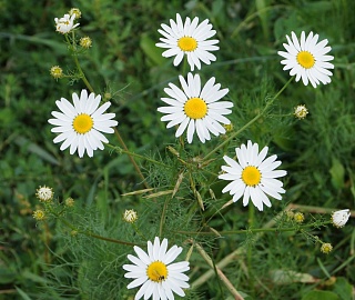 Цветки: в корзинках на верхушках стеблей, краевые язычковые, однорядные белые, средние трубчатые желтые.