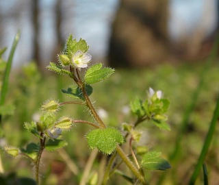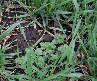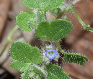 Цветок: маленький, 2-3 мм в ширину, расположенный поодиночке на довольно длинных цветоножках в пазухах листьев, от голубого до лилового цвета, чашечка четырёхраздельная.