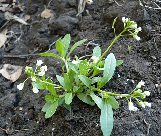 Листья: первые - от широко-овальных до продолговато-овальных, цельнокрайние или слегка зубчатые, черешковые, розеточные, плоско налегающие на землю; последующие - удлинённые, слегка выемчато-зубчатые, у основания стеблеобъемлющие, ушковатые.