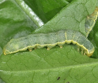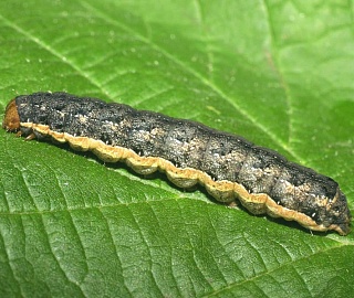 Гусеницы варьируют по окраске от серовато-зеленой до темно-бурой и почти черной. На спине имеют рисунок из темных пятен в виде елочки, по бокам тела желтоватую и светлые полоски. Гусеницы развиваются в течение 24-50 дней в зависимости от температуры, влажности воздуха и почвы, достигая длины в последнем 6 возрасте 35-40 мм.
