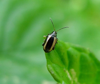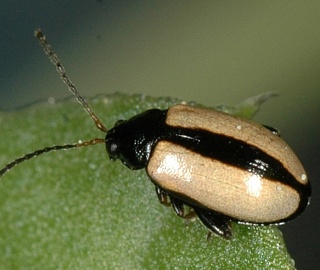 Волнистая блошка (размером 2-2,8 мм) черного цвета, желтая полоса на каждом надкрылье снаружи с глубокой выемкой.