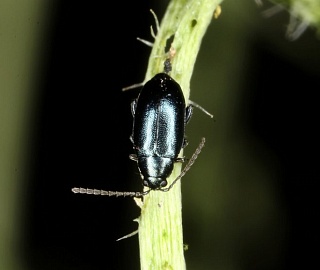 Черная (длина тела тела 1,8-2,5 мм) без металлического отлива, лоб и темя сплошь пунктированы.