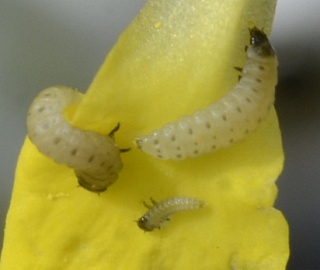 Личинка сероватая или желтоватая с 3-мя парами грудных ног, длиной до 4 мм, покрыта мелкими черными бородавками с волосками. Среднегрудной и заднегрудной сегменты имеют с обеих сторон по бурому роговому щитку. Личинки также питаются внутренностью цветков: пестиками, тычинками; живут 3-4 недели, линяют 3 раза. Поздно отродившиеся личинки объедают также и стручки. В течение жизни могут менять несколько цветков. Окукливаются в поверхностном слое почвы.