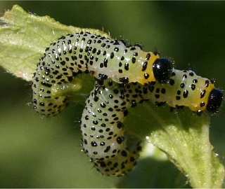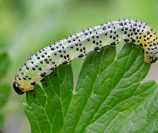 Личинка (ложногусеница) длиной до 17 мм, с черными щитками, бородавками и пятнами. Черные пятна на теле часто сливаются и соприкасаются. Голова черная, блестящая. Тело серовато-зеленое. Первый грудной и предпоследний брюшной сегмент желтого цвета. Личинка шестого (последнего) возраста травянисто-зеленой окраски без черных пятен. Потревоженные личинки S-образно изгибаются, поднимают задний конец тела вверх или падают на землю. Личинка последнего, шестого возраста не питается.
