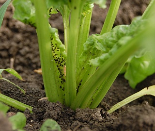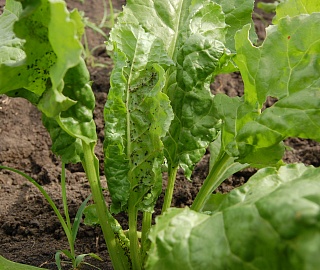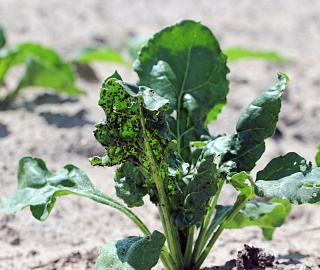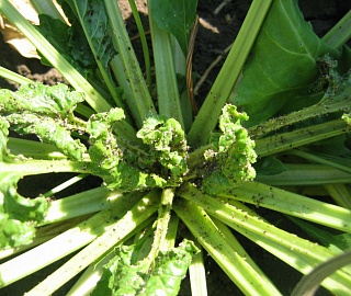 - Свекловичная листовая тля повреждает сначала внутренние, более молодые листья, вызывая их курчавость и скручивание, листья становятся коричневыми и засыхают.
