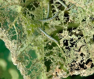 - Гусеницы повреждают растение, оставляя от него только черешки и прожилки, что нанаосит существенный урон урожаю.