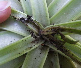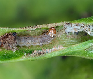Гусеница 10-12 мм, серо-зеленая, в последнем возрасте с пятью прерывистыми продольными розоватыми полосами. Гусеницы, отрождаясь, укрываются при основании черешков или в загнутых краях молодых листочков центральной розетки. Они развиваются 20-30 дней, проходя 5 возрастов. Гусеницы часто окукливаются в поверхностном слое почвы на глубине 1-5 см в небольших продолговатых коконах, облепленных снаружи частицами почвы. Через 10-20 дней из куколок выходят бабочки нового поколения.