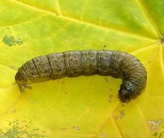 Личинка (гусеница) длиной до 40-50 мм землисто-серая с жирным блеском. Вдоль спины и по бокам темные полосы, кожа с мелкозернистой грануляцией, голова рыжеватая.