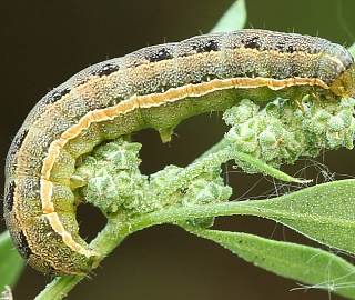Личинка длиной 21-40 мм. Цвет покровов от серо-зеленого до красновато-серого. Тело сверху в продольных полосках. Боковая полоса желтого цвета, широкая. Щетинки тела на точечных, чуть приподнятых щитках. Личинка развивается от 19 до 33 суток, проходя шесть возрастов. Молодые личинки скелетируют листья растений. Позднее объедают или продырявливают листовые пластинки по краю, уничтожают генеративные органы (бутоны, цветки, семена внутри бобов). Допитавшись, гусеницы первого поколения уходят в почву на глубину 2-4 см, изготавливают земляную колыбельку, в которой и окукливаются.