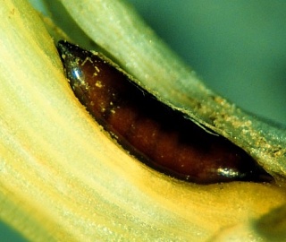 - В фазе выхода в трубку, питание личинок соком на растущих стеблях вызывает ослабление тканей в поврежденных участках, из-за чего происходит полегание и коленчатость стеблей.