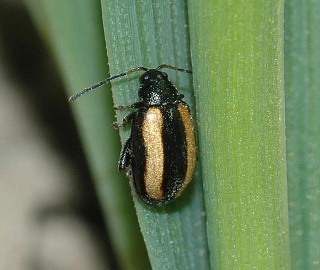 Продолговатый, черный, слабо выпуклый жук. Голова и переднеспинка с зеленоватым или голубым металлическим оттенком. Надкрылья с желтой полоской, внутренний край которой прямой, в заднем отделе загибается внутрь.