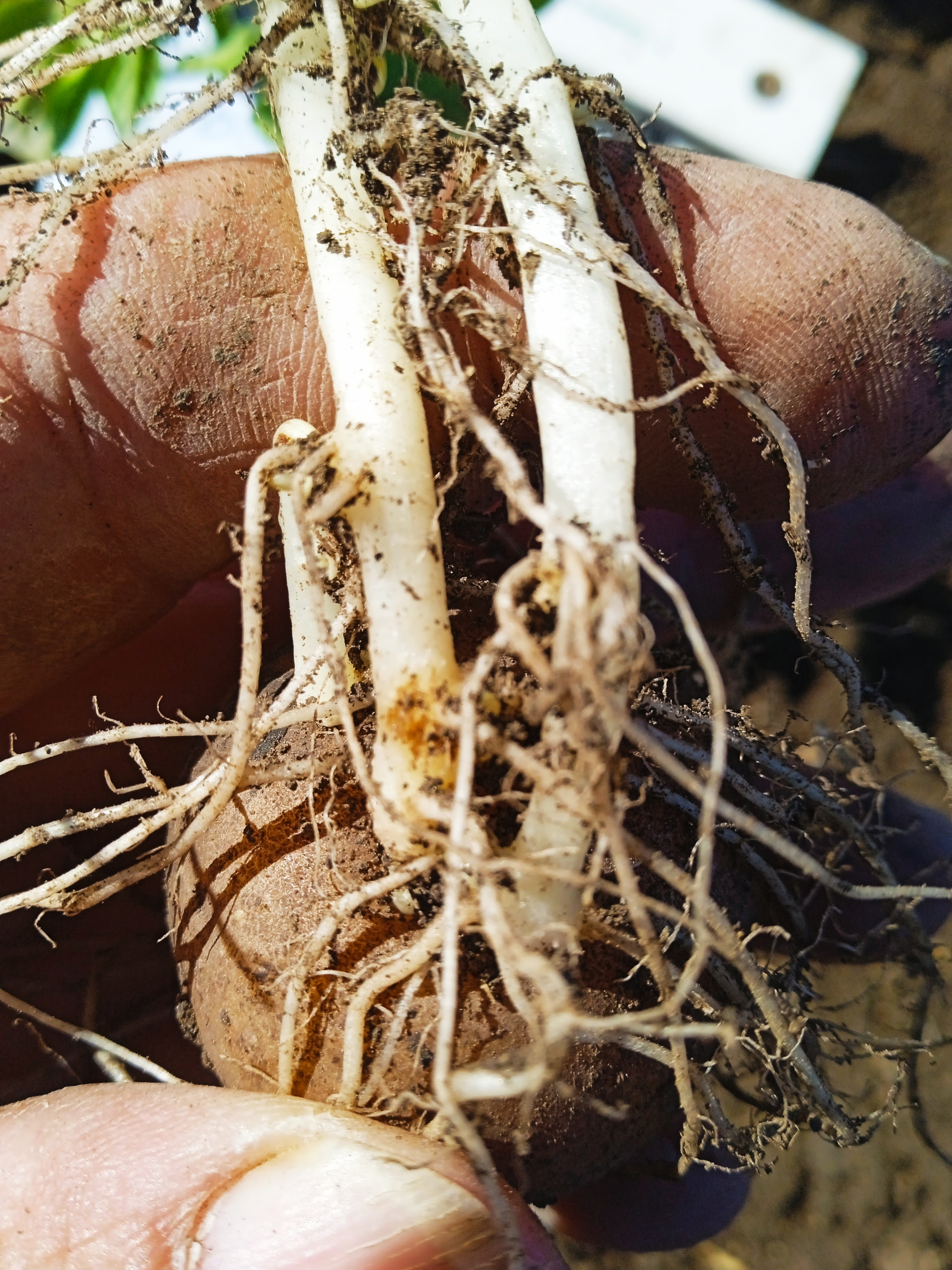Задача протравителей на семенах картофеля – бороться с фузариозом, серебристой паршой, паршой обыкновенной, ризоктониозом и другими патогенами. Особое внимание уделяется ризоктониозу, т.к. основной вред возбудитель наносит культуре именно в период всходов и роста молодых растений и не контролируется в период вегетации. На снимках, сделанных через 25 дней после посадки, можно увидеть преимущество схемы «Щёлково Агрохим»: если на варианте хозяйства (препараты с д.в.: флудиоксонил, тиаметоксам, седаксан, фипронил и микроэлементы) обнаружились следы ризоктониоза, то на опытном варианте таковых не было (фото 1, 2).