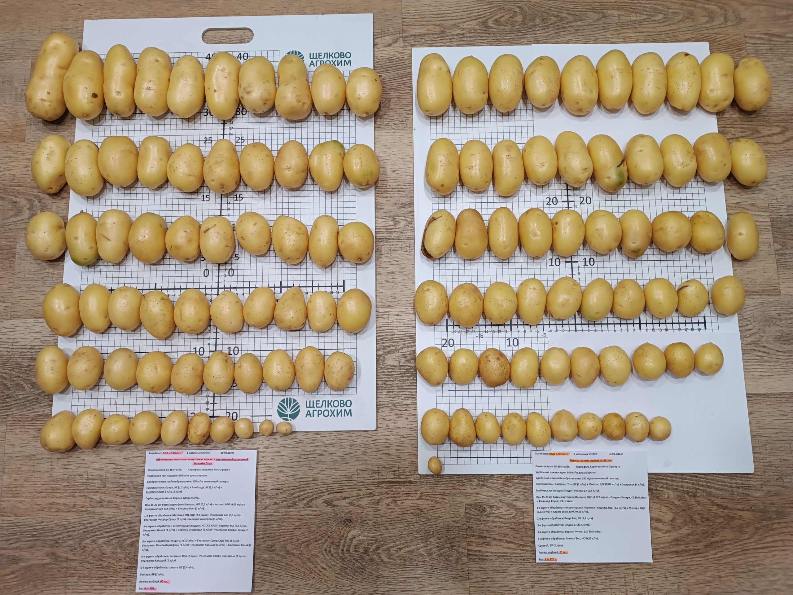 В 2024 году в Арзамасском районе на опытном поле ООО «Латкин» - крупнейшего производителя картофеля в Нижегородской области, специалисты испытывали схему защиты картофеля хозяйства и схему, предложенную «Щёлково Агрохим», в которой были задействованы новые продукты (см. таблицу). Клубни картофеля (сорт Королева Анна) при посадке были обработаны фунгицидными стробилуринсодержащими протравителями, в том числе ПУАРО, КС (0,4 л/т), а так же инсектицидом БОМБАРДА, КС (0,5 л/т) и аминокислотным удобрением БИОСТИМ СТАРТ (1,2 л/т).