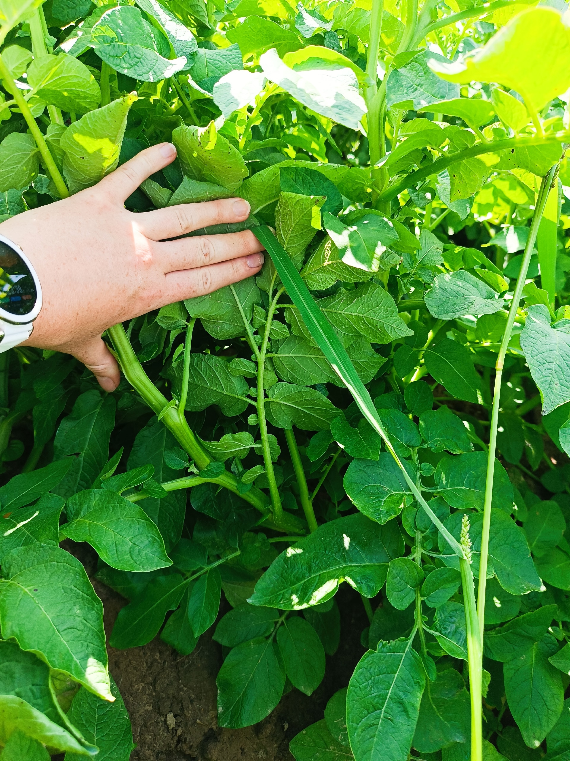 После гербицидных обработок и через 10 дней после первой фунгицидной обработки поле было идеально чистым от сорной растительности (фото 3, 4). На варианте «Щёлково Агрохим» отмечено начало цветения, и превосходство по количеству клубней – 5 против 3 в стандарте (фото 5). Преимущество достигнуто за счёт применения подкормки БИОСТИМ.