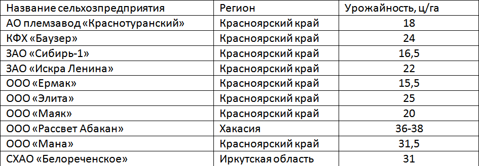 Каких ещё результатов по урожайности на сорте Форпост КЛ удалось добиться в Восточно-Сибирском регионе в этом году, см. в табл. 1.