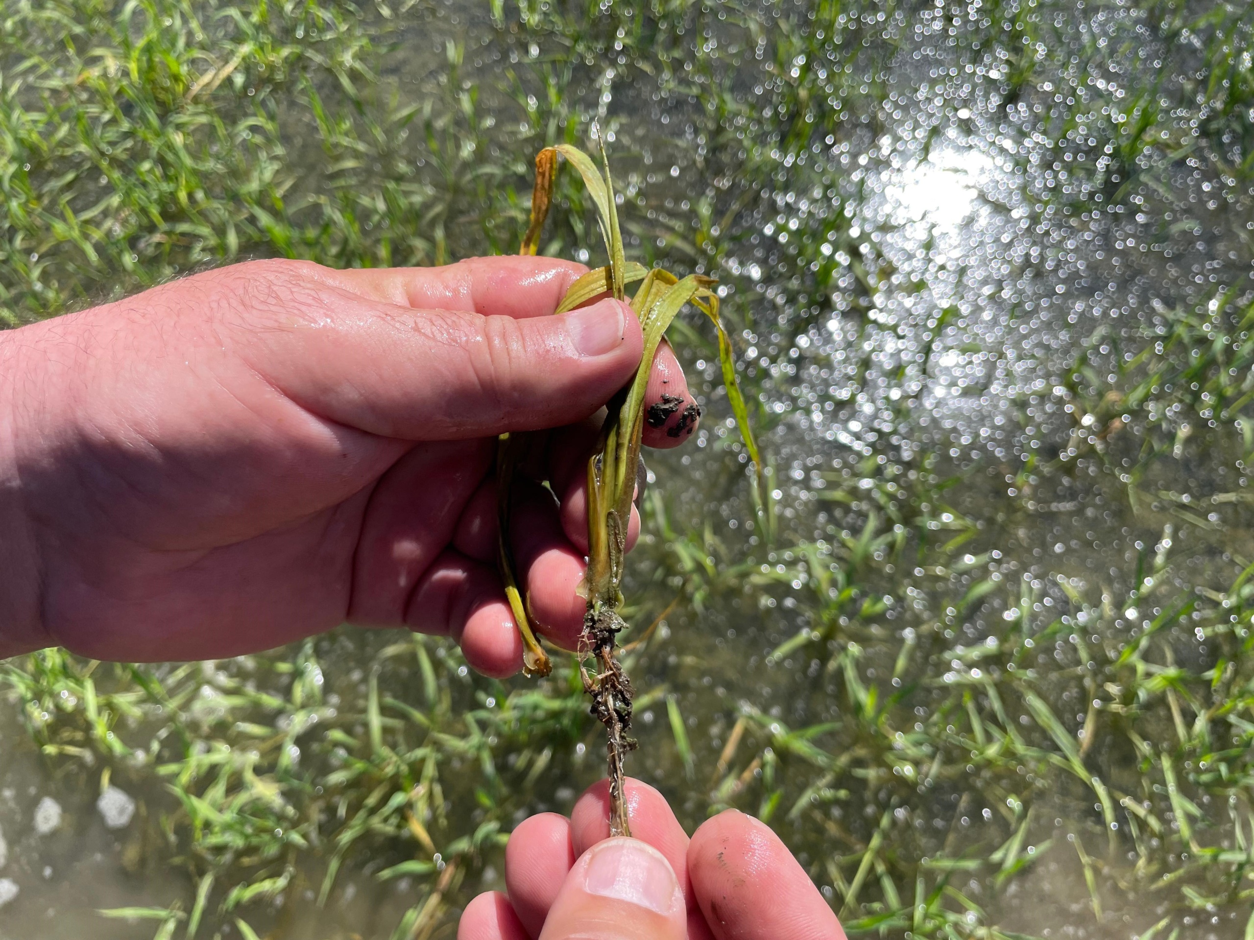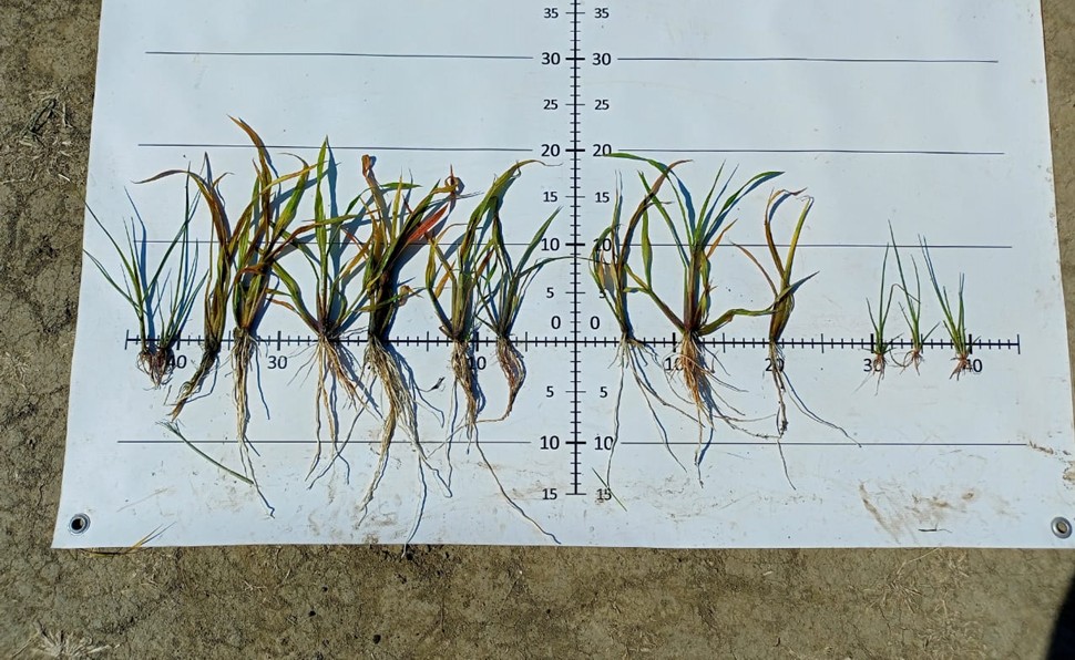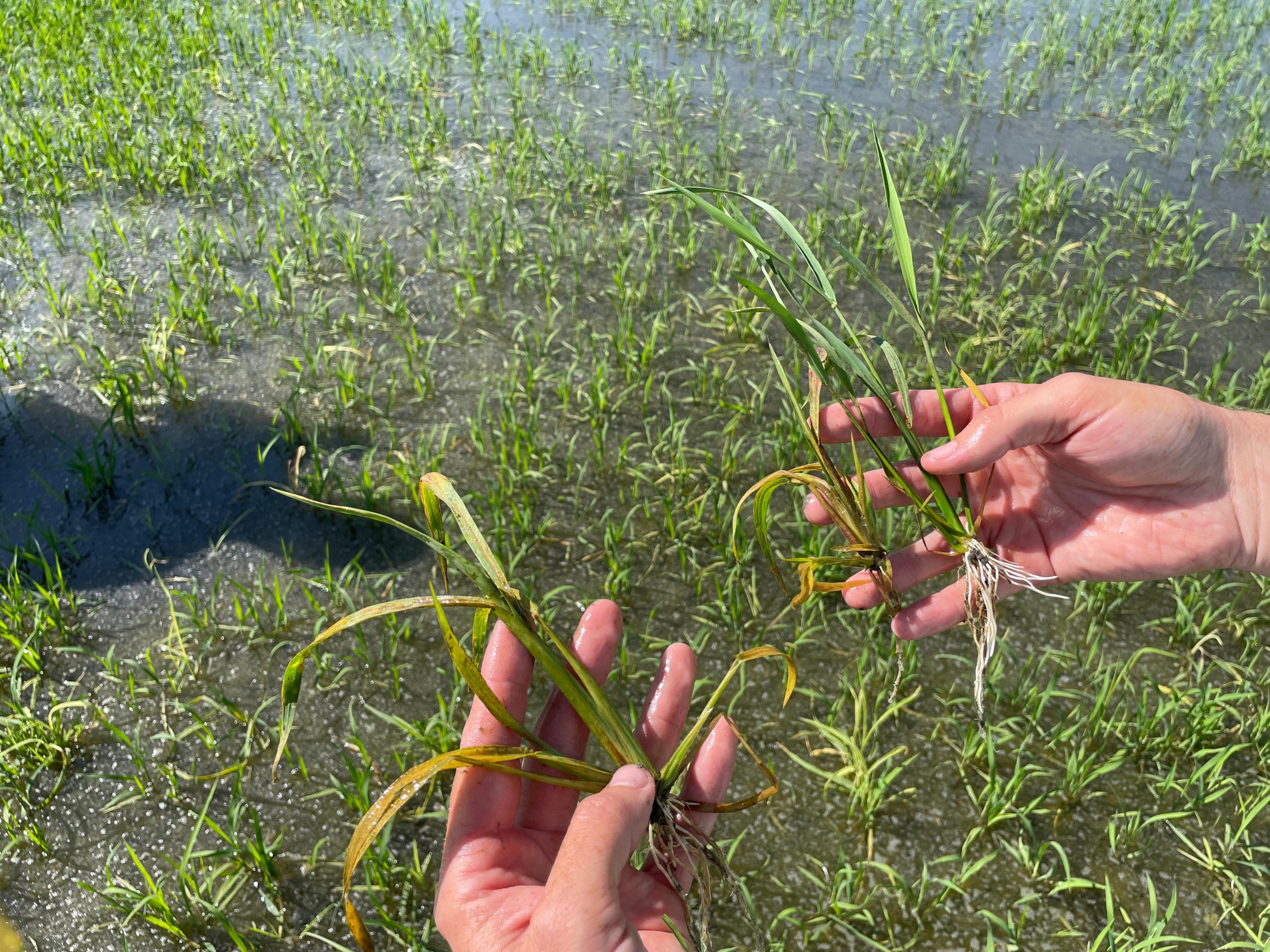 В предприятии ООО «Черноерковское» авиаобработку проводили в фазовое состояние риса и сорняков – 3–4 листа – кущение, просовидных насчитывалось на поле до 1500 шт./м2. На 6-й день после обработки на сорной растительности наблюдалось гербицидное воздействие, на варианте с РИЗОТТО, МД оно было более выраженное: хлоротичный окрас листьев, побурение и загнивание корневой системы. На хозварианте корневая система сорняка оставалась живой (фото 6). Биологическая эффективность гербицидов составила 100% – РИЗОТТО, МД, 96,6% – хозвариант.