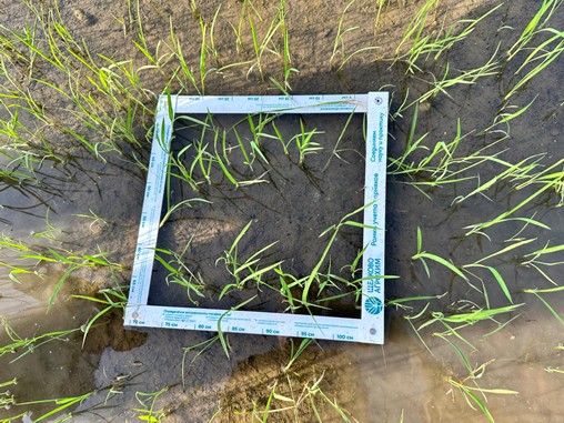 В ООО «Приволье» авиаобработку гербицидами проводили при уровне воды в чеке 5 см. Рис на момент обработки находился в фазе кущения, просо – 5 листьев – кущение. Также в посеве присутствовал сорняк сыть круглая в фазе 3 листа (фото 4). Количество просовидных не превышало 50 шт./м2. После обработки в течение суток уровень воды в чеке набрали до 10 см.