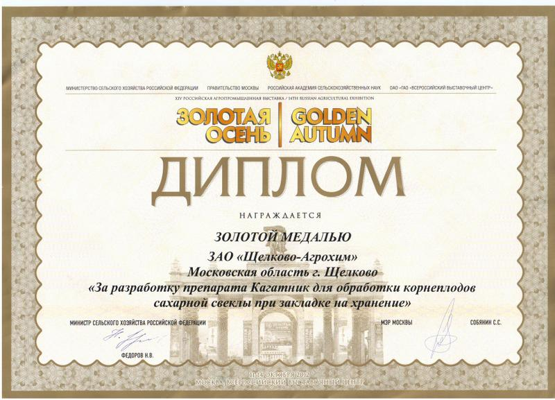 И поэтому совершенно логично и вполне заслуженно компания «Щелково Агрохим» была удостоена золотой медали выставки «Золотая осень-2012» - «За разработку препарата Кагатник для обработки корнеплодов сахарной свеклы при закладке на хранение».