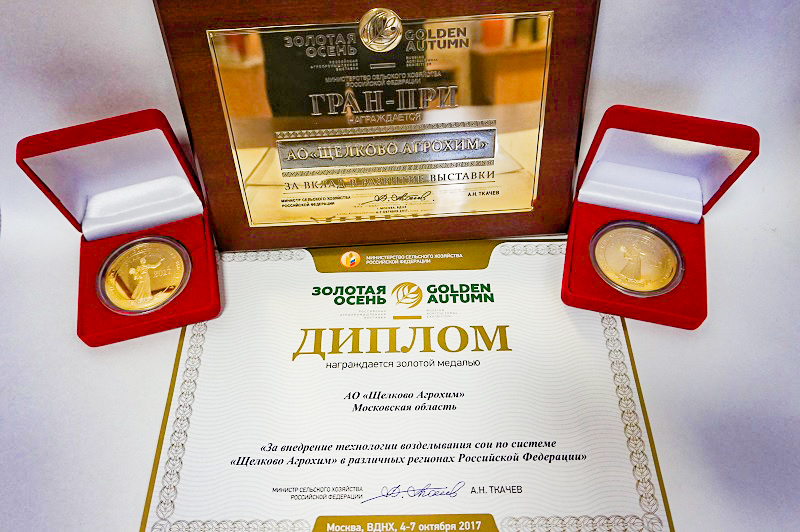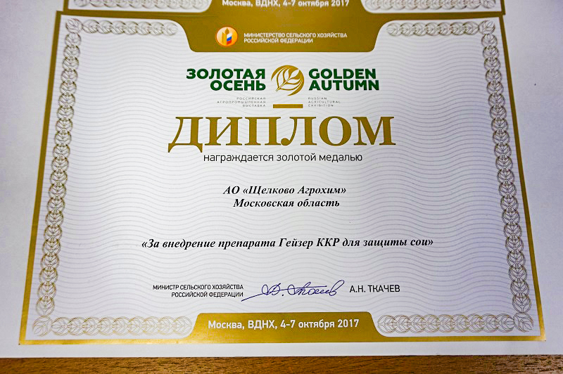 Все дни выставки на стенде «Щелково Агрохим» работали менеджеры и руководство компании. Итогом участия в выставке стали две золотые медали и дипломы от Минсельхоза РФ «За внедрение технологии возделывания сои по системе «Щелково Агрохим» в различных регионах Российской Федерации», а также «За внедрение препарата Гейзер, ККР для защиты сои». Кроме этого «Щелково Агрохим» получила гран-при выставки «Золотая осень-2017».